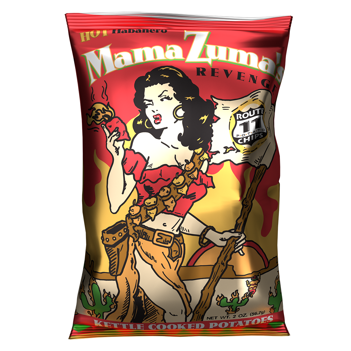 Our goal was to create a chip hot enough to satisfy most chileheads, yet still be accepted by the public in general. Mama Zuma's Revenge is a fiery blend of a habanero mash and our classic barbeque. True to the nature of the habanero, with your first crunch there's a delay that allows you to taste the delicious flavors. But within seconds, the incendiary habanero backdraft will light you up!! ALL NATURAL. GLUTEN FREE.