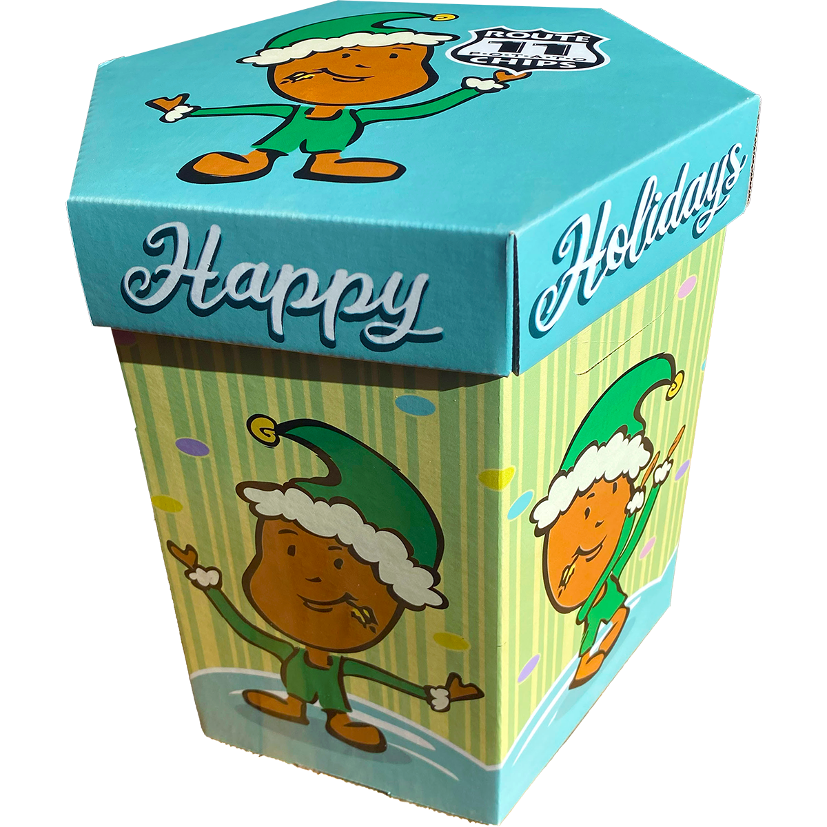 Three pounds of your choice of chips in a shiny, hexagonal gift box. "Rudy" (the Route 11 Spud Buddy) dresses up as an elf and dances his best moves across the six panels of this winter holiday gift box.